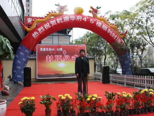 2010年10月26日,乾唐華府30層4#、5#住宅樓及地下車庫工程舉行了封頂儀式。集團(tuán)公司總會計師劉晏出席,集團(tuán)公司副總工程師、建設(shè)工程公司總經(jīng)理劉相杉,集團(tuán)辦公室主任梁平安以及集團(tuán)公司項目承建單位建設(shè)工程公司等人員到會參加。集團(tuán)公司總會計師劉晏在儀式上代表集團(tuán)公司作了發(fā)言講話。
