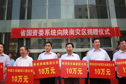 陜南災(zāi)區(qū)群眾的情況深深的牽動著陜西省外經(jīng)貿(mào)實(shí)業(yè)集團(tuán)全體員工的心,8月4日早上,省國資委系統(tǒng)國有企業(yè)向陜南災(zāi)區(qū)捐款儀式在省國資委大樓前隆重舉行,副省長姚引良、省國資委黨委書記白阿瑩出席了儀式。陜西省外經(jīng)貿(mào)實(shí)業(yè)集團(tuán)李鳳成副總經(jīng)理代表集團(tuán)公司向陜南災(zāi)區(qū)捐款10萬元,以實(shí)際行動支持陜南災(zāi)后恢復(fù)重建和突破發(fā)展工作。