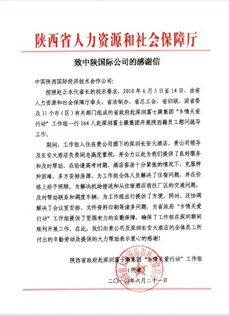 2010年6月5日至6月14日,陜西省有關(guān)部門組成的省政府赴深圳富士康“鄉(xiāng)情關(guān)愛行動”工作組一行164人在深圳富士康集團開展陜西籍員工慰問疏導工作,并入住我集團所屬深圳長安大酒店。在此期間,深圳長安大酒店的領(lǐng)導高度重視,和酒店全體員工全力以赴,克服困難,認真做好接待服務(wù)工作,為工作組在深圳的工作提供最優(yōu)質(zhì)服務(wù)和幫助,得到了工作組的高度贊揚。工作組回到西安后,特別致函我公司表示衷心感謝。