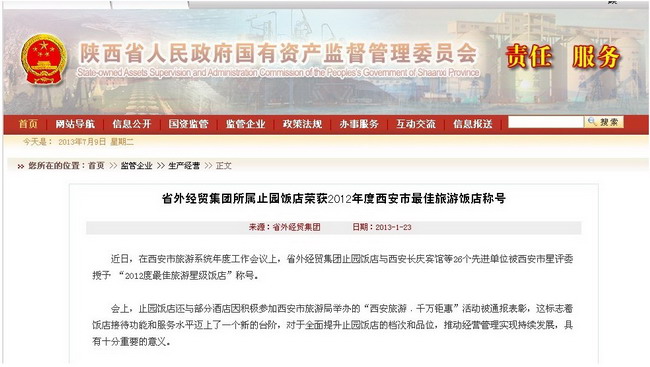 省國資委網(wǎng)站轉(zhuǎn)載:集團(tuán)所屬止園飯店榮獲2012年度西安市最佳旅游飯店稱號(hào)