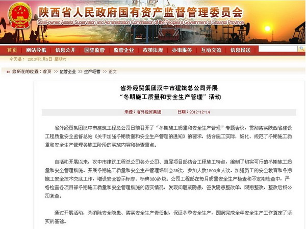 省國資委網(wǎng)站轉(zhuǎn)載:集團(tuán)漢建總公司開展“冬期施工質(zhì)量和安全生產(chǎn)管理”活動