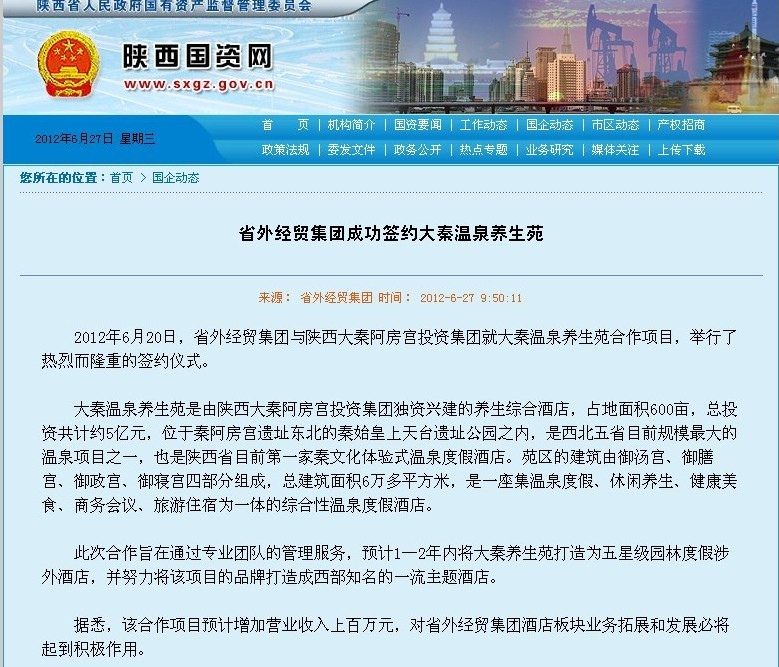 省國資委網(wǎng)站登載:省外經(jīng)貿(mào)集團(tuán)成功簽約大秦溫泉養(yǎng)生苑