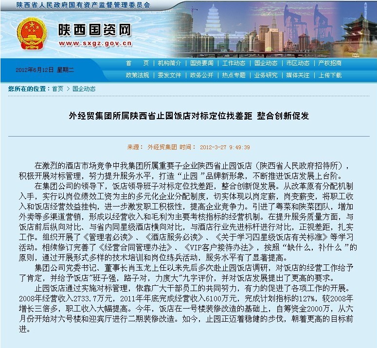 省國資委網(wǎng)站登載:外經(jīng)貿(mào)集團所屬止園飯店對標(biāo)定位找差距 整合創(chuàng)新促發(fā)展