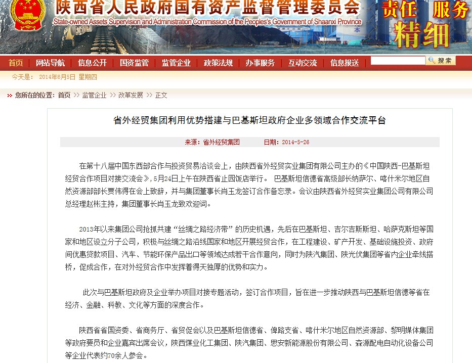 省國(guó)資委網(wǎng)站轉(zhuǎn)載第十八屆西洽會(huì)期間集團(tuán)公司主辦《中國(guó)陜西—巴基斯坦經(jīng)貿(mào)合作項(xiàng)目對(duì)接交流會(huì)》情況