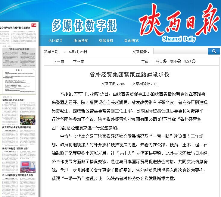 陜西日報(bào)刊登---省外經(jīng)貿(mào)集團(tuán)緊跟絲路建設(shè)步伐
