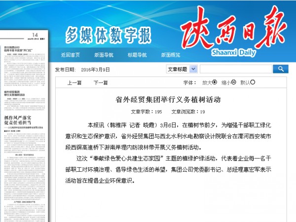 陜西日?qǐng)?bào)刊登---省外經(jīng)貿(mào)集團(tuán)舉行義務(wù)植樹(shù)活動(dòng)
