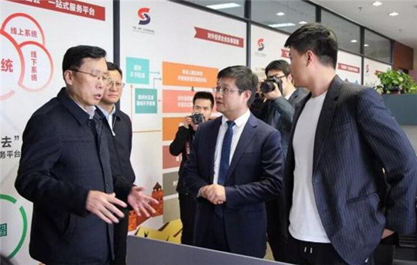 在陜西省“走出去”一站式服務(wù)平臺(tái)的啟動(dòng)儀式上,陜西省外經(jīng)貿(mào)綜合服務(wù)有限公司董事長劉國強(qiáng)(右三)向陜西省副省長魏增軍(左一)詳細(xì)介紹平臺(tái)的線上構(gòu)架、服務(wù)內(nèi)容以及運(yùn)營規(guī)劃等情況。