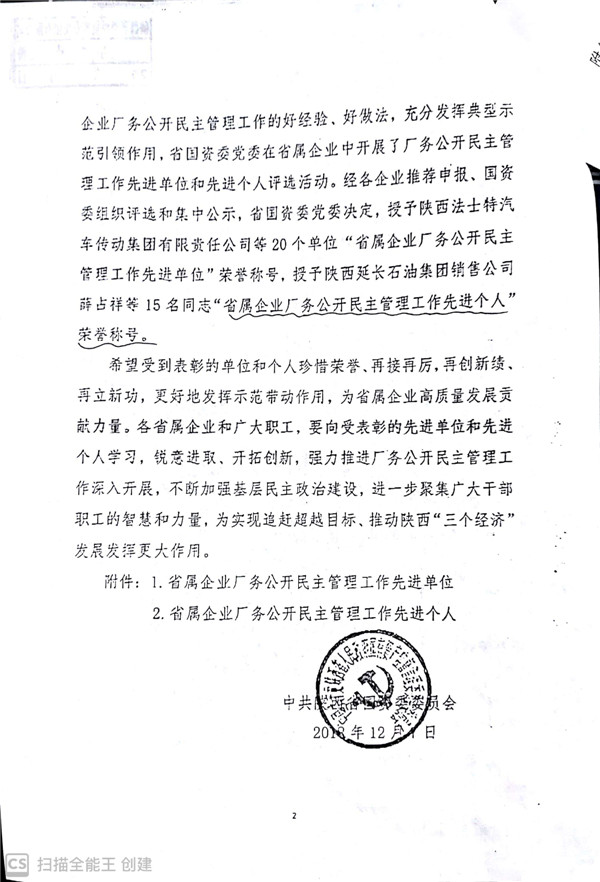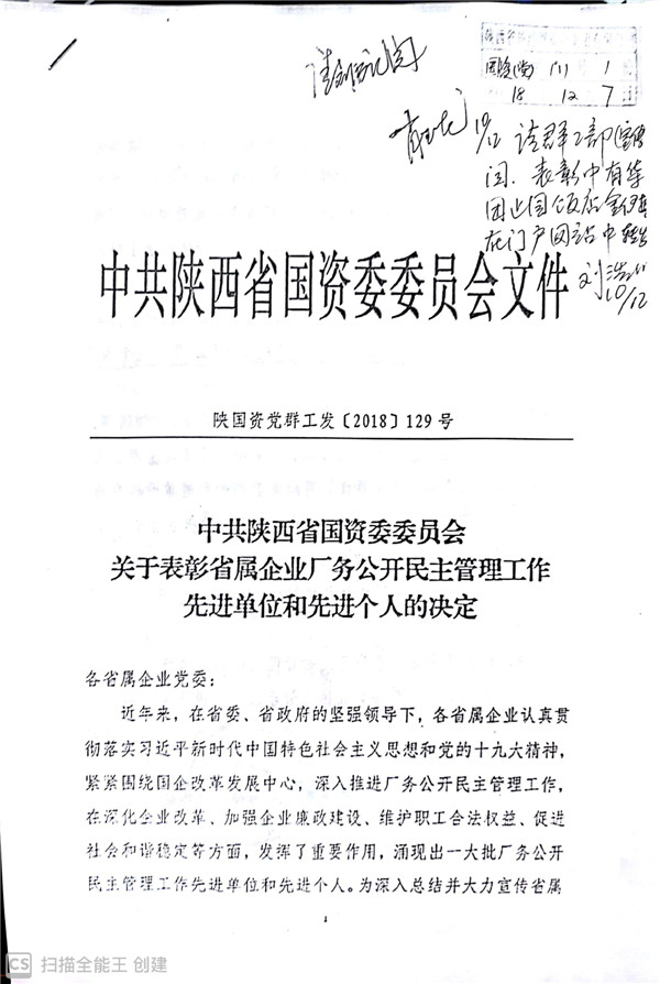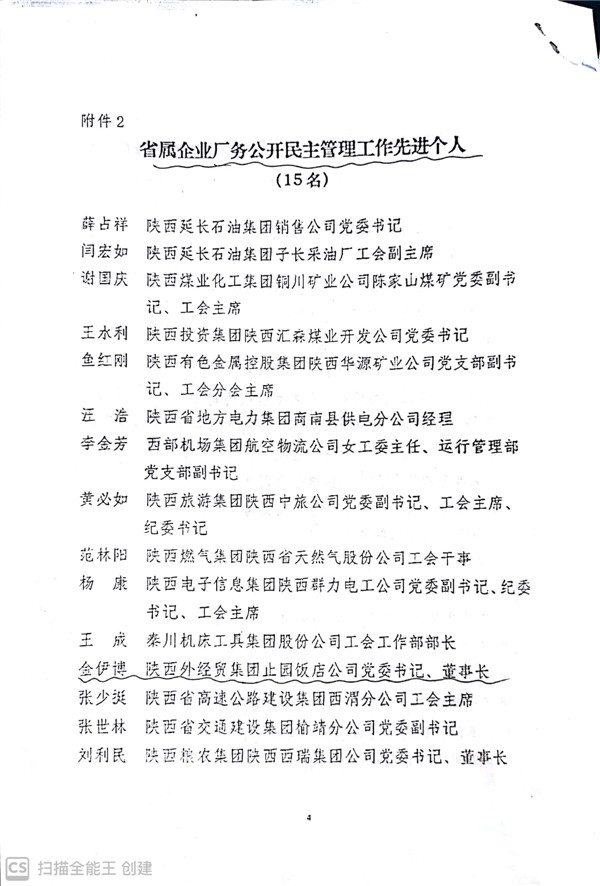 陜西省止園飯店有限責(zé)任公司黨委書記、董事長(zhǎng)金伊博獲得省國(guó)資委系統(tǒng)“廠務(wù)公開民主管理工作先進(jìn)個(gè)人”稱號(hào)