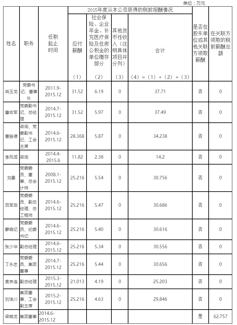 1.上表披露薪酬為我公司負(fù)責(zé)人2015年度全部應(yīng)發(fā)稅前薪酬,按國家規(guī)定由單位繳存各種社會保險等。其中,第(1)項由國資委(薪酬審核部門)核定。